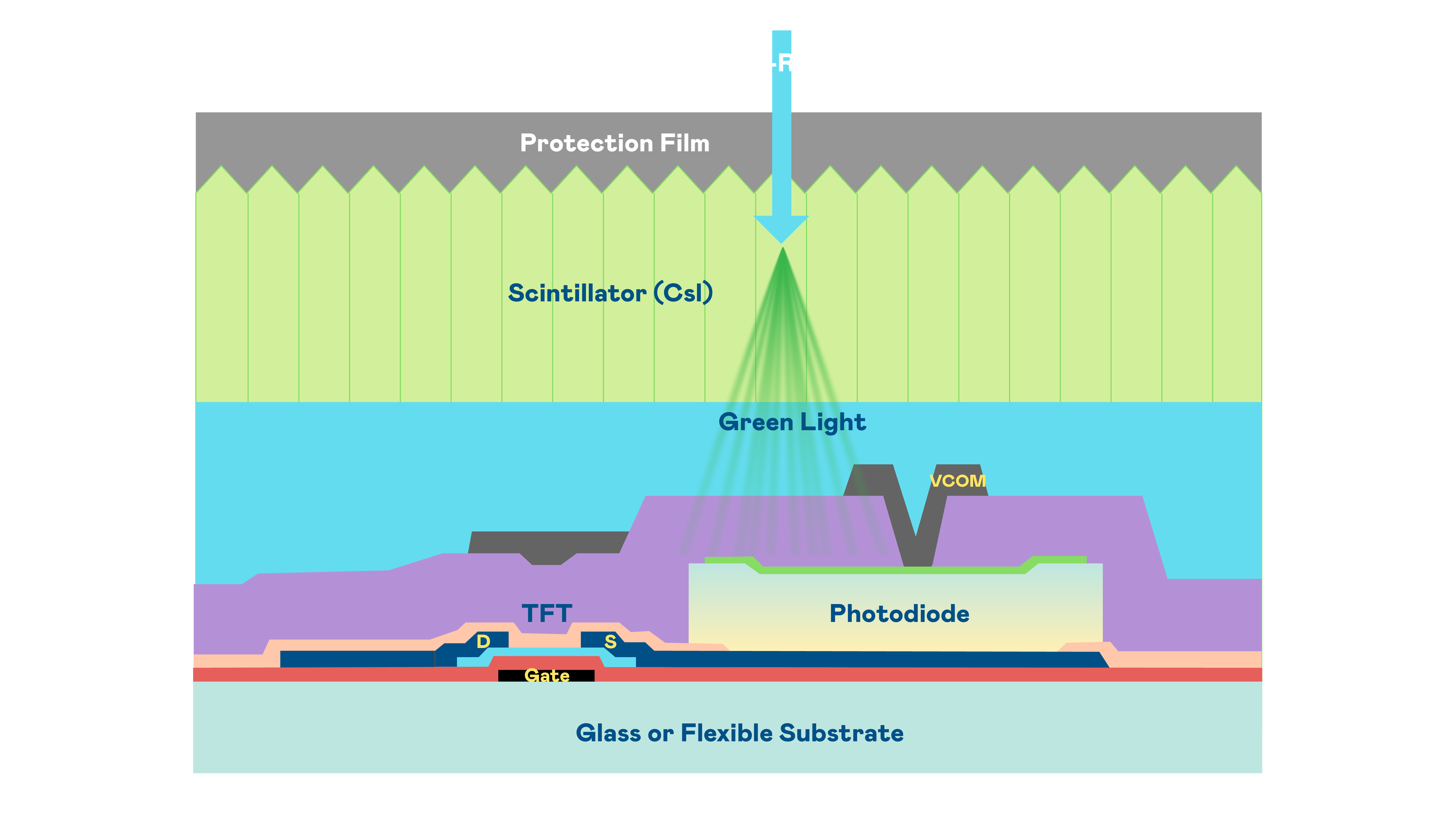 皇冠体育的X光影像感測陣列使用薄膜電晶體 (TFT) 作為每個像素的讀取開關,搭配光電二極體(Photodiode)的光電轉換元件,用以感測X光影像訊號。